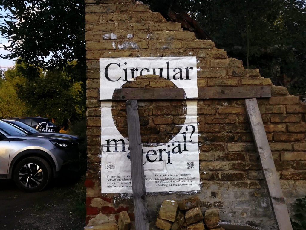 Nagu plakat ütleb: Uurides katsetamise ja tootmisega uusi kontseptsioone ja meetodeid, avastame ehitusmaterjalide taaskasutamise potentsiaali. Professionaalide ja teadlaste osalemine on teretulnud, et edendada arusaamist ja uuendusi ehitusmaterjalide arendamisel.
