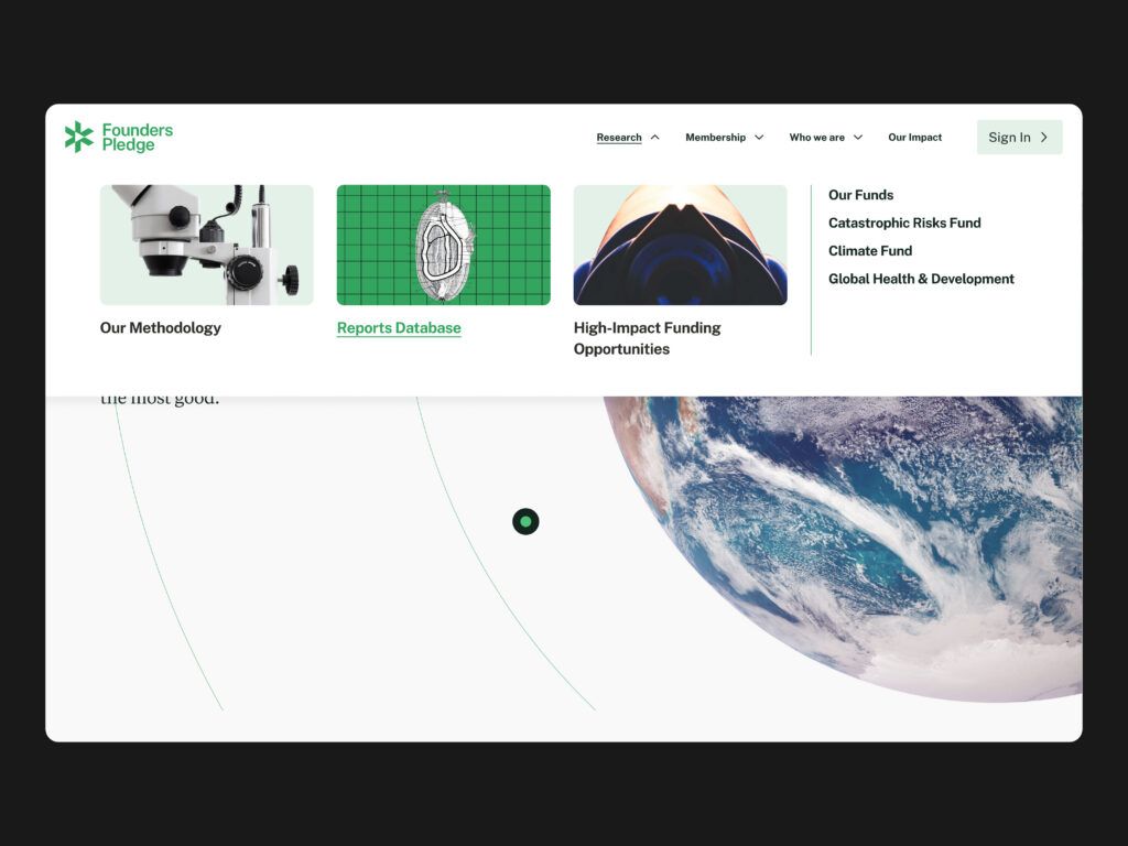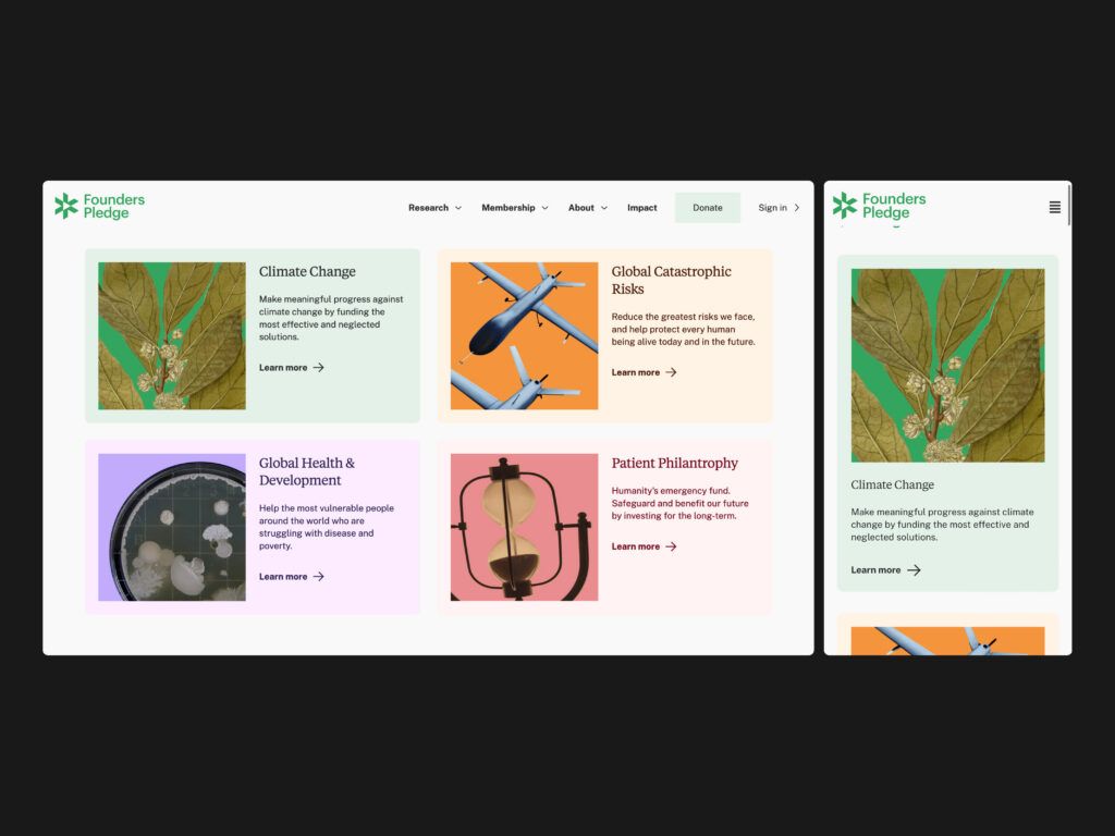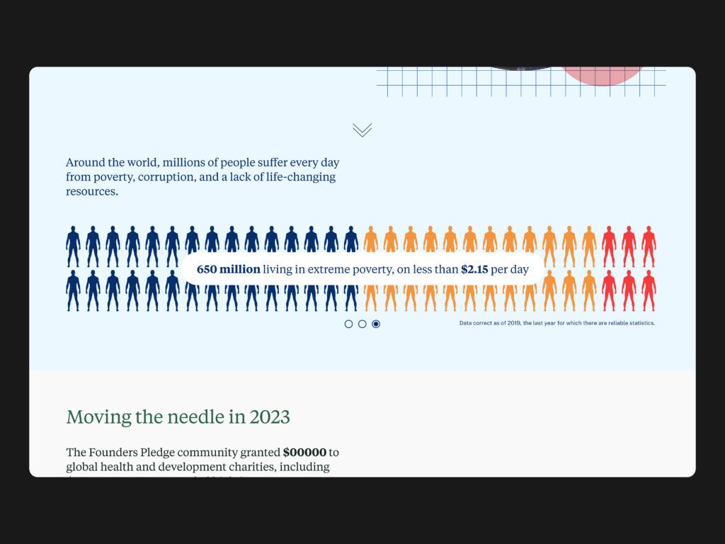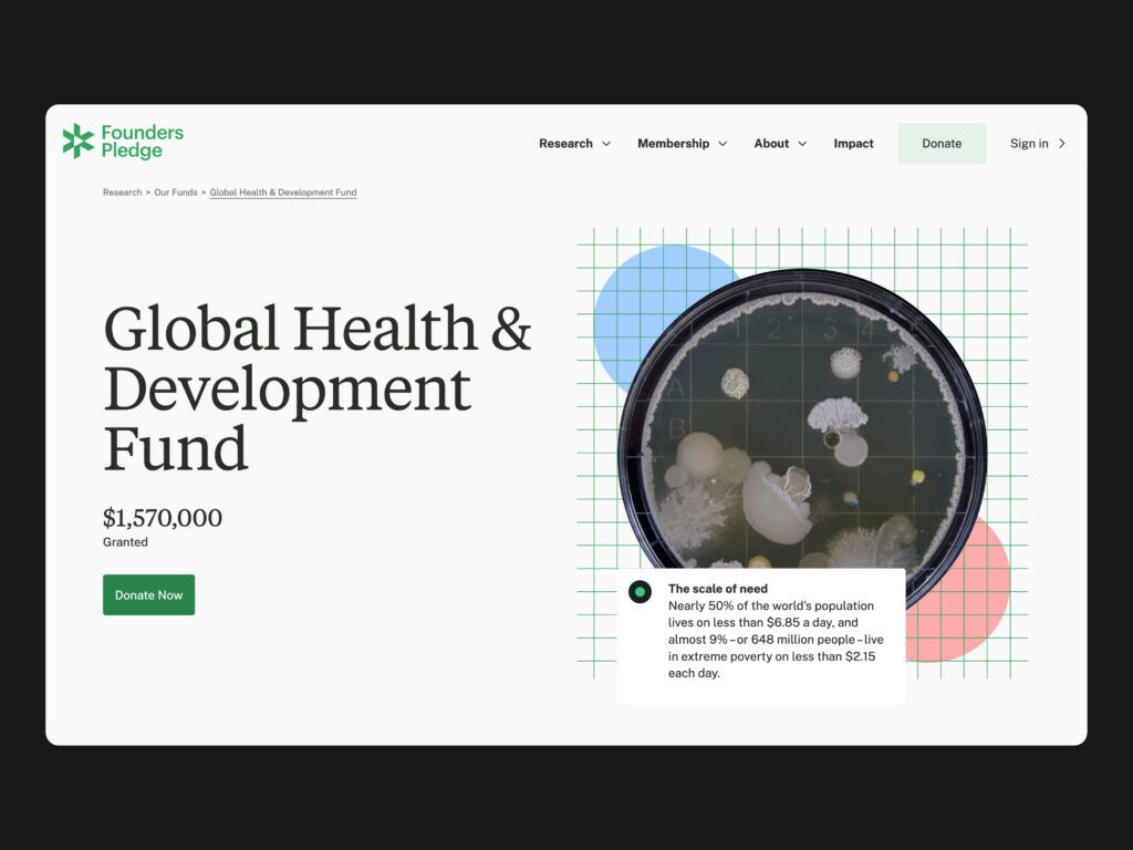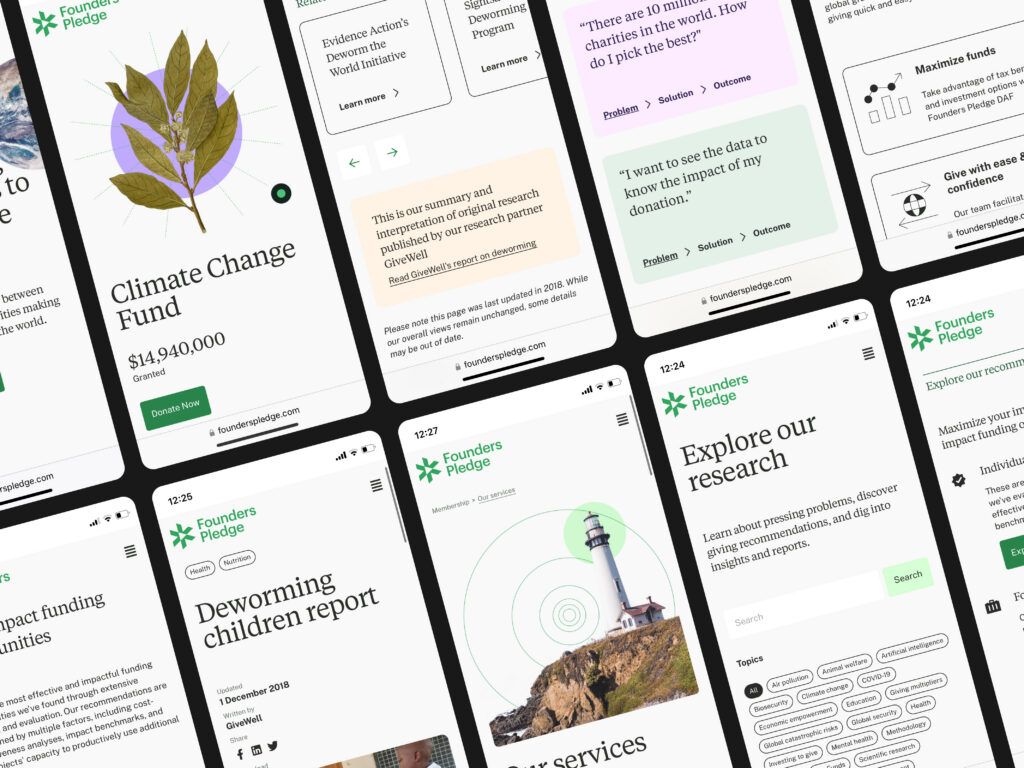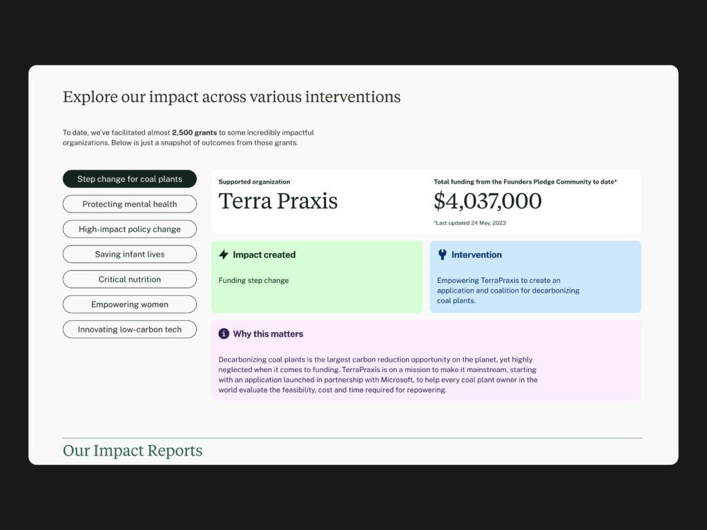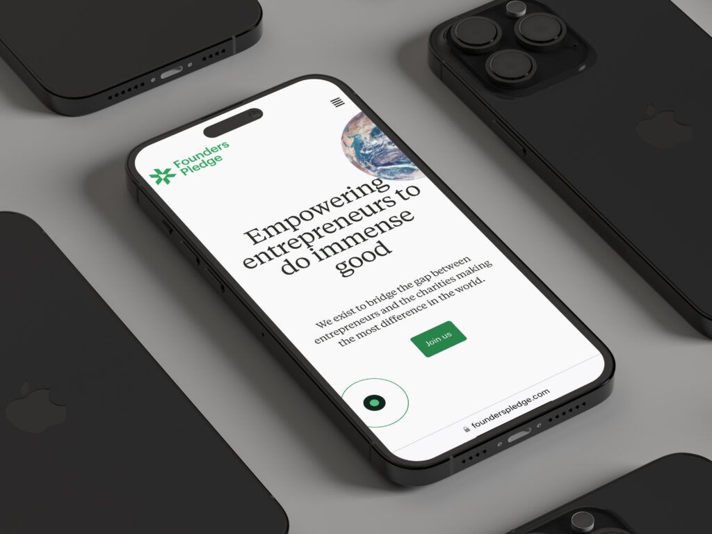 Founders Pledge maksimeerib heategevuse mõju, aidates tehnoloogiaettevõtjaid maailma suurimate probleemide lahendamisel. Nende liikmed on panustanud heategevuseks üle 10 miljardi dollari. Veebileht on tulevaste ja praeguste liikmete peamine kontaktikoht, mis pakub teavet protsessi ja liikmelisuse kohta. See toimib ka tööriistana, sisaldades mõjuaruanded ja ulatuslikku uuringute andmebaasi.
