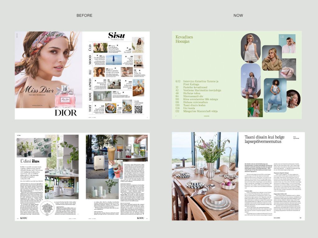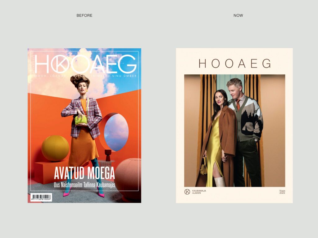 Hooaeg on Eesti suurima tiraažiga ajakiri, mis jõuab 45 000 lugeja koju. Meilt telliti ajakirja uuendus, mis tooks värskust, pööraks tähelepanu disainile ja lõpptulemus oleks põhjamaine. Pärast analüüsi ja tihedat koostööd kliendiga viisime ellu kolm läbimurdelist muudatust: tõstsime esile silmapaistvad tooted ja moefotod; kujundasime kompositsioonid, et lugejale jääks rohkem ruumi visuaalide nautimiseks ning vähendasime üleüldist tektsi mahtu, et ajakirja saaks pikemalt sirvida. Tulemuseks on ajakiri, mis püüab pilke ja kaunistab kohvilaudu.