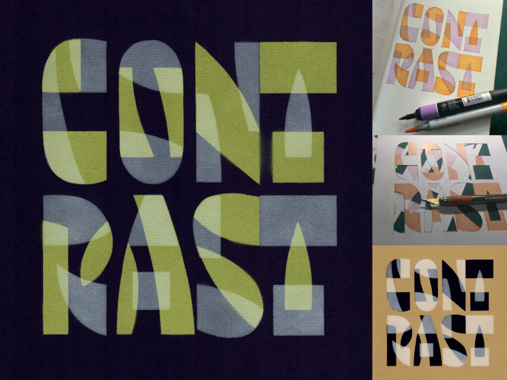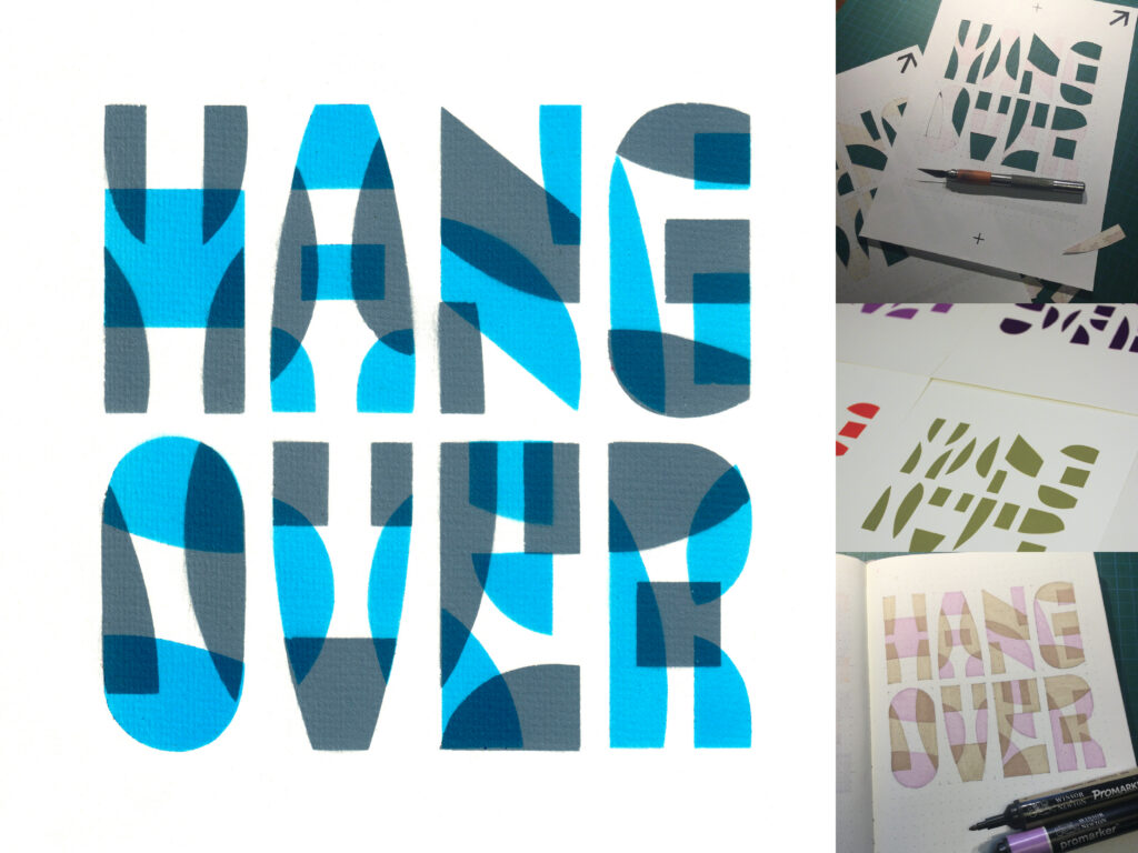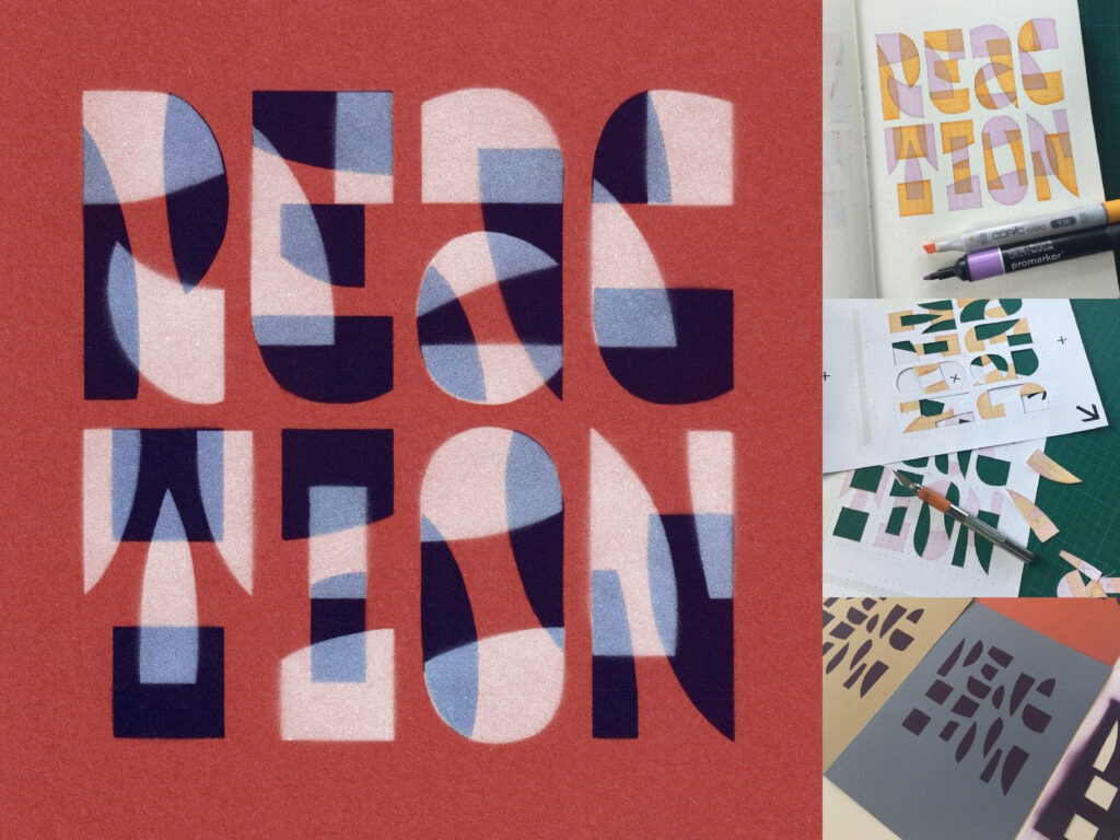 Minu šabloonkirja projekt sai algse tõuke instagrami #36daysoftype väljakutsest, kus tuli igal järjestikusel päeval postitada üks täht. Katsusin hoiduda arvutis joonistamisest, et vormides säiliks teatav juhuslikkus ja naturaalsus. Kui tähtedele oli ring peale tehtud, hakkasin looma neist kompositsioone. Eesmärk on esmases järjekorras dekoratiivsus, erinevate toonide katsetamine ja teha käsitsi midagi loovat. Kahe värvi kasutamisel kaovad ära kirjatrafareti iseloomulikud sisevormide sildamised ja ühtlasi tekib ülekatetes kolmas toon.