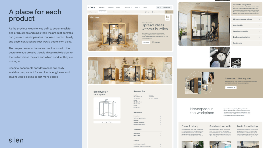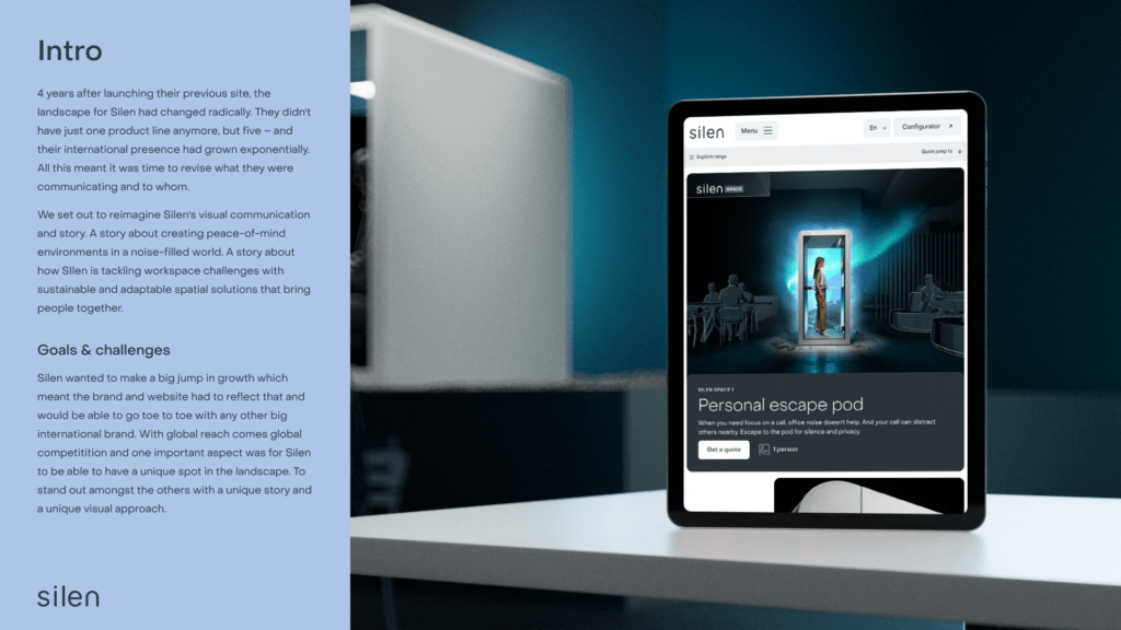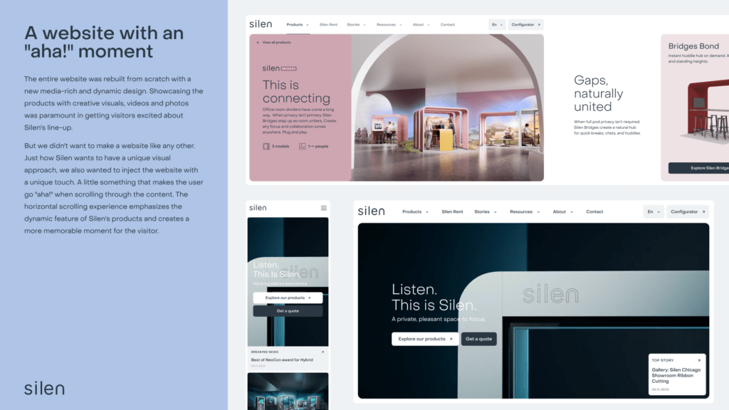 Peale 4 aastat toimus Silenis radikaalselt muutused kogu toomisprotsessis ja tooteliinides. Enam polnud tegu ettevõttega kes loob ühte toodet vaid 5 erinevat tooteliini. Oli vaja uut lähenemist kogu kommunikatsioonile ning loole. Tegime põhjaliku eeltöö ja uuringu kasutajate, klientide ning partnerite seas. Tulemuseks tegime rebrändingu nii visuaalses identiteedis kui kommunikatsioonis ning disainisime ja arendasime uue veebikeskkonna koos kõigi vajalike osadega nagu SEO, copy, 3D animatsioonid ja visualiseeringud jne.
