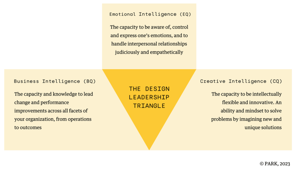 These forces appear repeatedly in our work with design leaders and form the backbone of the PARK Design Leadership Academy. We describe them as three core dimensions of design leadership – Creative Intelligence, Business Intelligence & Emotional Intelligence.
