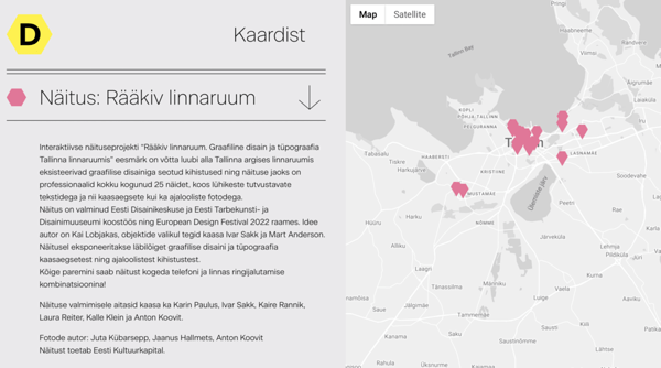Selleks, et tuua disain inimestele lähemale, korraldasime 2022.a. ka 2 näitust. Oleme uhked, et Euroopa Disainiauhindade raames sai loodud näitus Rääkiv Linnaruum (kuraator Kai Lobjakas, tekstide autorid Ivar Sakk, Karin Paulus, Anton Koovit, Kai Lobjakas, fotode autor Juta Kübarsepp). Sellel põneval näitusel eksponeeritakse läbilõiget graafilise disaini ja tüpograafia kaasaegsetest ning ajaloolistest kihistustest Tallinna linnaruumis, mis on leitavad veebipõhises kaardirakenduses Tallinn. Design.